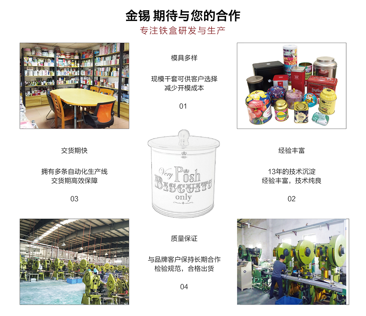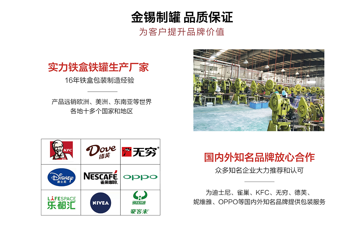 廣州市金錫五金制品有限公司成立于2016年,是已有13年生產(chǎn)經(jīng)驗的實力廠家。我廠是專業(yè)定制優(yōu)良馬口鐵盒、鐵罐、禮品盒、茶葉罐、月餅盒等金屬鐵盒包裝的制罐企業(yè),我們擁有超過6000平方米的標準現(xiàn)代化廠房及八條生產(chǎn)線。公司集產(chǎn)品研發(fā)、設(shè)計、生產(chǎn)、銷售于一體,技術(shù)優(yōu)良,實力雄厚。通過十多年的制罐經(jīng)驗,我們擁有專業(yè)的技術(shù)團隊,嚴格的作業(yè)流程、完整的品質(zhì)保障體系、完善的銷售以及售后服務系統(tǒng)。